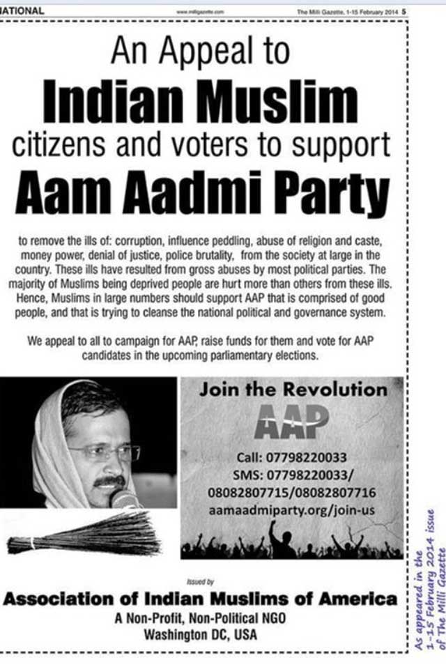 | It was a debut few could dream of. They had unbelievable amount of goodwill and overt support from Mainstream Media that few political parties can boast of. Aam Aadmi Party burst onto the scene like a quintessential Bollywood hero who has everyone cheering for him when he first appears on the screen. However, little after a month of forming Government in Delhi, the AAP seems to have been crushed under its own weight. To carry the Bollywood analogy further, the script seems to have let down the hero. Actually in the case of AAP, there never was any script. All it really was, and continues to be, is a large cast of average actors who are all working according to their own script that they have written for themselves. Multiple scripts, below-average production quality and director who vacillates and flip-flops at every take will only result in disaster of a film. In the real world, this scenario leads to anarchy and break-down of systems, as has happened in Delhi. Those of us who have followed Arvind Kejriwal’s career trajectory had been warning about AAP’s dangerous script. AAP’s promises of curbing corruption and cleansing the system succeeded in hypnotising many which is not surprising given the widespread misgovernance of the Congress-led UPA. The governance vacuum left by Congress made it easy for so-called revolutionaries to stage their ‘Occupy Delhi’ movement and garner support. The same bunch of people would not have commanded the mind-share they did now, even as recently as five years ago. Complete abdication of statecraft, big-ticket corruption, and breakdown of even a semblance of governance by Congress made the call of anarchists appealing. Now that the motley group is in power, their shortcomings are more than visible to all. That they have no experience in governance was known to all. That they would not even make an effort to learn with humility and grace was not known. Arrogance and ignorance is always a very dangerous combination. Protesting against the Government about everything and anything is easy. Anybody can replace misgovernance with chaos. The challenge is to replace existing misgoverance with good governance and have long term vision. This is where AAP is failing miserably. To say ‘we are neither Leftists nor Rightists’ is not being pragmatic. It is actually being confused and opportunistic. AAP is dangerous because under the garb of ‘aam aadmi’ and Arvind Kejriwal’s routine number ‘we are nobody, we are crushed and cursed Aam Aadmi’ they are practicing politics of the worst kind. With other political parties, one knows what to expect. Some parties, like the SP and BSP, openly ask for votes on the basis of caste and religion. Congress follows divisive politics and then hopes that the divided and fragmented voters will vote for them. AAP has aped the worst that these parties have to offer. The only difference is that other parties have dropped the pretence of hypocrisy. But the AAP, with its broom and aam admi cap, epitomises hypocrisy. Arvind Kejriwal will do his aam admi number while at the same time finding nothing wrong with unconstitutional Khap Panchayats because elections need to be won in Haryana. I was shocked to find this appeal in newspaper called Milli Gazette by an NGO called Association of Indian Muslims of America which is a non-profit, non-political NGO registered in Washington DC, USA. As far as I know it is illegal for NGO’s to indulge in any political endorsements overtly or covertly. Setting aside the legality of such an appeal for a moment, the blatant communalism that such an appeal reeks of, is revolting. I was not able to find any statement from the AAP distancing itself from this organisation. I looked at their press releases and searched their website but could find nothing. That any organisation could issue such an appeal for AAP says a lot about the kind of politics this party must be practicing.