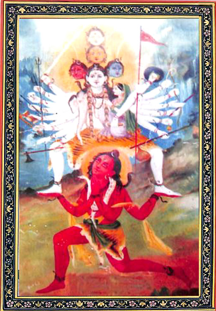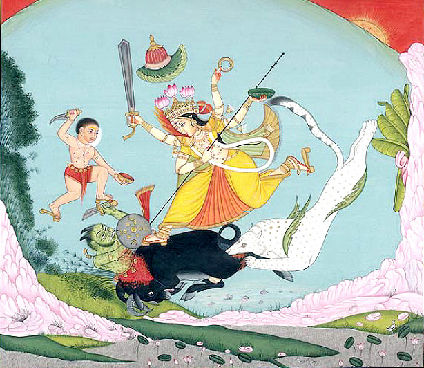 | My obeisance to the Bhagawati Vindya Vasini, who is also revered as thr ‘Kailasa Vasini’. She is the Shamasana Vasini making her abode in the crematoriums, where she is always roaring with the sound of Huma Bija Mantra of the Devi, whose echo is felt in the Kaala or serial Time and the Akasha or space, being the two Tattvas, as described in the Para-Pravesika. She is verily, the Katayani sixth in the line of the Navba Durgas,and revered as the daughter of the KatyayanaRsi, who would meditate in the Himalayan Mountain for receing grace from the Maha Shakti She is the Mother of Kumar Kartikeya. The Mahadevi happens to be the sister of Govinda, adored as being born in the home of Nanda ---the chieftain of the cowherds.She is adored as the Kshiti Kanttha, adoring the white throat with the jewels. She is the Mother with the Eighteen arms, surrounded by the snakes, having the bracelets for decorating the arms. She can not be conquered, who is adored with sword, trident, damaru, mudgara, Chashkala, bow and arrow. Thus she graces with her ‘Vara and Abhaya’ mudras in her hands holding the Vedas, skull Khatwang, Gadaa, Moosula, Tomara Chakradiscus. She is the source of the All mercy, having supreme excellence in her workings. She is Chandika, Chandaghanta, dressed in the garb of a huntress.