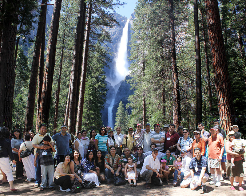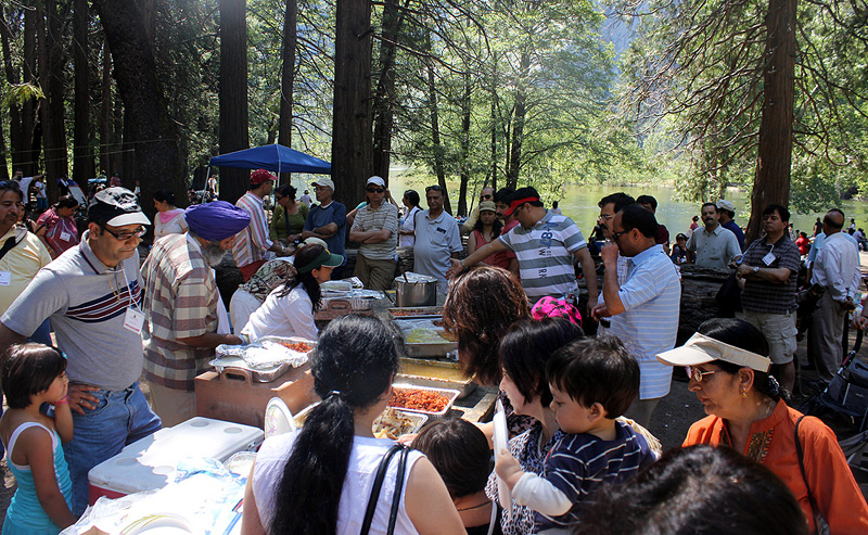 Day 2: It got kick started with few of the attendees going for a hike and most of them had a continental breakfast at the hotel itself and proceeded towards the community hall where luxury buses where waiting for them to take them to Yosemite valley for day picnic. Chole puri was waiting for all as the traditional breakfast at the hall and after having that most of the attendees boarded the bus and few of them took the option of driving in their own cars. The trip started at about 10AM and what a ride it was, full of fun music and masti. It was a adventurous and surprising drive as lot of hidden talent was discovered during the drive, with many of the adults and kids coming out with their singing skills, for some parents it was surprising to see their kids so talented which they were not aware of at all. Due to the July 4th weekend the traffic into the valley was overwhelming, it took us more than 2 hours to get to the spot which was reserved for our picnic and the drive to that spot through the twisting and turning road was reminiscent of the drive which we used to take from Jammu to Srinagar. No one complained of the long drive as it was quite a nostalgic trip as it took us back to those tiresome road journeys which we used to take quite often when living in Kashmir. The spot which was chosen for our picnic on the banks of a river with the Yosemite falls in the background and surrounded by trees and nice grassy area again took us back down the memory lane of the picnics which we used to do in Kashmir. In all respect it seemed as if we were back in Kashmir. Due to the heavy traffic lunch was delayed and made few of us anxious but in the end it turned out worth a wait with a nice warm Indian food. After the lunch all of us took a walk of about a mile to the foot of the Lower Yosemite falls, and what a view it was with the sierra mountains having more than normal snow this year the fall was its full flow. We were all back in the bus at around 5PM and driving back to the community hall as there were lot of activities waiting for the evening.
