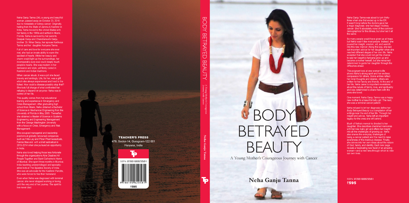 | Neha Ganju Tanna was about to turn thirty-three when she first ended up in the emergency room. It wasn’t long before the doctors gave her a tragic diagnosis: she had stage 4 kidney cancer. She fit absolutely none of the common demographics for this illness, but she had it all the same. One moment, Neha Ganju Tanna was a happy new mother to a beautiful baby girl. The next, she was a terminal cancer patient. So many people would have given up all hope, but Neha wasn’t like most people. Instead, she poured her insight, wisdom, wit, and warmth into this new memoir. Along the way, she laid out important advice for her daughter when she reached different stages of her own life. Neha accepted that she would not get the chance to see her beautiful Aariyana grow up and become a mother herself, but she remained determined to guide her daughter through the difficulties ahead. This poignant look at one woman’s life shows Neha’s strong spirit and her endless compassion for others. Some entries reflect her inner thoughts and desires; others are written for her family and friends. At the end of her life, Neha came to important revelations about the nature of family, love, and spirituality and was determined to share them with the ones she loved. Neha refused to let her diagnosis define her. Body Betrayed Beauty is a compilation of her writings near the end of her life. Through her insight and advice, Neha left an important legacy for the ones she left behind. Much of Neha’s memoir is directed to her daughter. She describes cherished memories with her new baby girl and offers her insight into all the challenges of growing up. Neha also shares the everyday challenges of being a cancer patient and the need to raise awareness of the insidious disease. Finally, she delves into her own ideas about the nature of God, family, and identity. Each new page reveals a fascinating new facet of an amazing woman—and a new lens through which to view our own lives. |