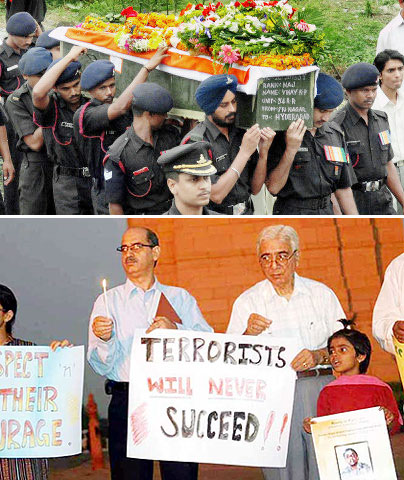 Major K.P. Vinay and Major D.R. Raman, were killed in a 40 hours long gunbattle with Lashker-e-Tayiba militants in the Tangmarg area of Baramula district in Kashmir. The officers were killed while fighting a group of 9 terrorists, who had infiltrated from across Line of Control in the Gulmarg sector. All nine militants were killed in a three-day long gunbattle, in which deceased officers had led from the front. While Major Vinay, who was scheduled to get married later this month, hailed from Hyderabad, Major Raman belonged to Chennai. Major K P Vinay died on the spot while Major D Raghuraman who had sustained fatal gunshot injuries succumbed to his wounds in the hospital. "Don't let any militant escape," these were the last words of Major Raghuraman when he was air-lifted from the gun-battle spot Picture courtesy: Shiv Kumar Bhat.,AIKS, Delhi (India) |