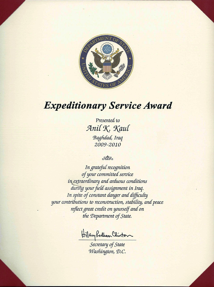 Dr. Anil K. Kaul from Tulsa, OK USA was nominated by the US Department of State for the “Expeditionary Service Award” for his assignment in Iraq. Secretary of State Hilary Clinton awarded the citation for committed service in extraordinary and arduous conditions during his field assignment in Iraq. Dr. Anil K. Kaul, M.D., D.D.S., M.P.H., associate professor of 'Obstetrics & Gynecology' at Oklahoma State University Center for Health Sciences, also received the Science Achiever of the Year award at the South Asian Excellence Awards ceremony in New York City in 2008. Dr. Kaul’s research focuses on infectious diseases with special interest in women’s health related issues including premature births. He holds several patents including one for early detection of premature births. His current research involves developing new diagnostic tools for early detection of cancer, and osteoporosis, as well as wireless monitoring of pregnancy. |