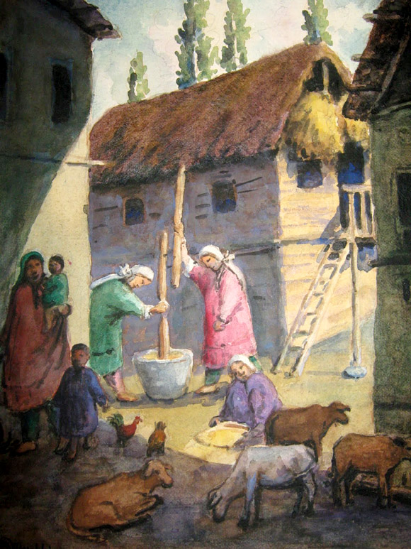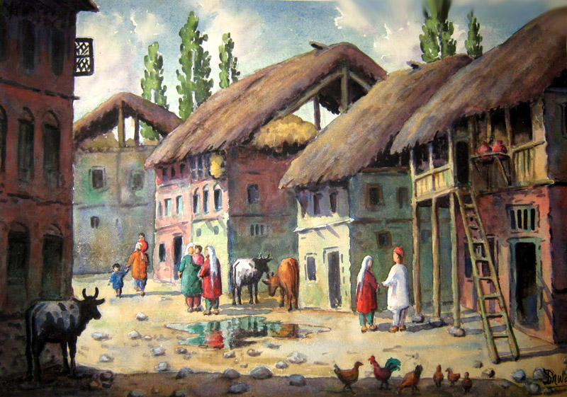 Recently Dr T K Walli brought about 60 water colours of his late father all the way from karnal to jammu for an exhibition sponsored by Academy Of art Culture and languages Every one who saw this treasure got mesmerized . You were transported to another world. It was Nostalgia and sheer reconnection with roots for most of the viewers.You could see Dal lake, Pahalgham Gulmarg, Village scenes, Maar canal scenes, Ganderbal scenes, Bazars, Birds, Hills, Brooks, Snow clad Mountains, Poplars, Chinars men and women doing daily chores to exist and last but not the least the Beauty of this land reflected abundantly in almost all the water colour landscapes .You could see peasants, Boatmen, Village women husking rice in KUNZ (Big stone bowl ), Fruit laden trees, shikaras, and houseboats. |