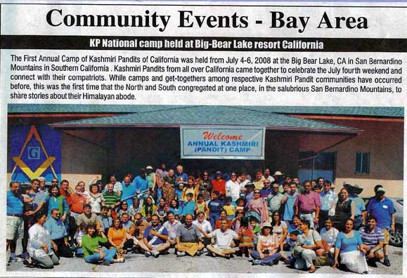 | The First ever Annual Camp of Kashmiri Pandits was held from July 4-6, 2008 at the Big Bear Lake, in San Bernardino Mountains in Southern California. Kashmiri Pandits from all over came together to celebrate the July fourth weekend and connect with their compatriots. While camps and get-togethers among respective Kashmiri Pandit communities have occurred before, this was the first time that so many KPs in west congregated at one place, in the salubrious San Bernardino Mountains, to share stories about their Himalayan abode. This nostalgia-fest commenced with invocations and introductions on Friday evening and was sustained by almost non-stop activities involving everybody, from the two year toddlers to great grand parents; kid painters,paino players and trumpet players, cricket diehards and Antakhshari aficionados were everywhere. Renowned Kashmiri Pandit singer Mr. Rajendra Kachroo flew in from New Delhi for attending these celebrations. This weekend was a celebration of freedom, but it was also the celebration of a people with roots that lay in 6000 year old history in the lap of Western Himalayas in the Kashmir Valley. For a community that has lost its ancestral moorings to terror and fanaticism this camp rekindled a sense of 'belonging'. The second day of the camp (Saturday) started with yoga and meditation followed by a forum discussion on how best to preserve and advance the Kashmiri Pandit heritage. The general theme in almost all the presentations the focus was on the American born Kashmiri Pandit youth to maintain and further enrich our glorious heritage and culture. It is they who need to draw from the riches of their past ancestry and carry centuries-old Shivist beliefs of freedom and self introspection beyond rituals and fanaticism to practice and prosperity, spiritually and materially. This camp had been planned around thinking and talking about Kashmiri pandit culture, music, and Kashmiri Pandit life in general; light-hearted takes on life in the valley, complete with a humorous skit depicting the reactions of an old parent visiting their daughter in the USA. While disco and dancing kept the attendees company till late in the night with contributions from local singers and dancers, it was Rajender Kachroo who kept the audience rapturous and engaged with Bhajans and Kashmiri folk music all through, every evening. |