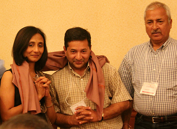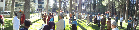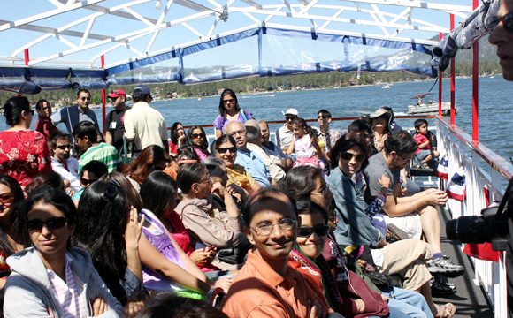 Though the meet officially started in the afternoon of 3rd of July, many of the organizers arrived at the venue a couple of days earlier to ensure that all the participants would be comfortable and all amenities taken care of. This year the event was organized at Western Big Bear Chateau and we had almost 90% of the hotel reserved for our event. We had a huge conference room dedicated for our main event and another conference room with huge kitchen attached was also secured for the event. This was used for our dinner and lunch and also for kid’s activities. The food was prepared by our caterer at the kitchen itself who had setup his own tandoor for hot naan. Participant families had come from different parts of California and also from the other parts of US like Nevada, Utah, and Florida and also from India and Canada. There was a mix of all the generations and it seemed as if all had gathered for a big marriage event as it takes place in a Kashmiri family.Here are some of the highlights from each day of the event: July 3rd 2010 Day 1: Participants were warmly received by the welcome team at the specially set up hospitality desk where they were given their room keys and welcome packet that included a beautiful keepsake go green tote bag. That was not all, the organizers had such an eye for detail that they had slipped in personalized welcome letter for each family in their rooms. It really felt as if we were at a corporate conference as the venue was worthy of one.Campers who arrived at the venue, famished after long drives were treated to scrumptious chicken tikka, pakoras and delicious samosas… all that with a refreshing kehwa and then assembled in the Olympian Ballroom where the event started with a warm word of welcome by Dr Jyotika Wali who embraced everyone by her warm and cajoling Kashmiri words of welcome. Then it was the turn of all who were present in the hall to introduce themselves to each other, even though there were some familiar faces but we had some new faces too. One of the highlights of the introduction by almost everyone was that they not only spoke from where they were coming to attend the event but they also spoke about the place from where they actually came from Kashmir. Participants were given introduction of Mrs Sushma Kalla who had come all the way over from India to enthrall the audience with her melodious voice. Over the next two days she would be entertaining everyone with the mix of Kashmiri songs, Bhajans and also Hindi songs and Ghazals. The evening program started with the lighting of auspicious lamp in front of Lord Ganeshji’s idol and a very famous Kashmiri Bhajan dedicated to Shree Ganeshji. After this it was the time to test the knowledge of all the adults in the audience with the quiz about Kashmiri proverbs which was conducted by our own Mr. Inder Kaw. There were nice prizes to be won for each correct answer, everyone in the audience showed great enthusiasm in participating in the quiz and almost all the questions were answered by the audience with the exception of few which they were unable to crack. Inder Ji also read special poem penned by Vinod Razdan from Chandigarh titled “treyum vohorwod” signifying the 3rd National KP Camp is USAfter doing the brain exercise everyone in the audience wanted something different so to relax them all and to get the fun element in the evening there was a nice laughter filled short Kashmiri Skit Titled “Dr Huttie Muttie” which was presented and acted by Paviter Handoo and Rajeev Sumbly. It 4th July 2010 Day 2: The day started with a hot breakfast in the Le Bistro restaurant by the lobby and everybody assembled outside the main entrance of the hotel, there was a bus waiting to carry us all over to the shores of Big Bear Lake where a cruise boat was arranged for a two hour long trip in the lake. This was reminiscent of the Doonga ride which every Kashmiri is familiar with from way back in Kashmir when families would board shikaras and would spend the day in Dal Lake. Everyone was on board the liberty cruise ship after a brief introduction by the captain of the ship the microphone system on the ship was handed over to us and once again Sushmaji started her songs this time she was accompanied by many participants who were show casing their own singing talents. The two hours on board went by pretty quick and we would have continued for some more time if the boat would have been available. We were all back by 12.30PM and hot lunch was waiting for all of us at the hotel and everybody had lunch and started preparing for the reminder of the day. There was a panel discussion after lunch which was attended by seniors and youngsters of our community equally. The discussion started with a slide show by Deepak Ganju showing the plight of Kashmiri Pandit houses in Kashmir after the exodus in 1990. The slide show was heart rending and almost everybody present there had their eyes moist. The topic for the discussion was regarding the setting up of cultural center which had been initiated in the last year camp. Everyone present there put forth their ideas and finally the discussion concluded with the setting up of different groups which would see that this dream of having a first cultural center of Kashmiri pundits in the world of its kind be set up. More details about this center would be released by the committee members at appropriate times. Around the time when elders were busy with the panel discussion, Kids activities were organized in the lawns of hotel alongside the swimming pool. They were organized by Mrs Monica Rangroo Dhar. All the kids participated in various games and also some of them enjoyed the swimming at the pool. After the kids activities and the panel discussion everybody gathered in the lawns for a memorable photo session in the traditional Kashmiri bride and bridegroom dress. This is one for the albums and everyone had great time in clicking these pictures. While the pictures were being clicked