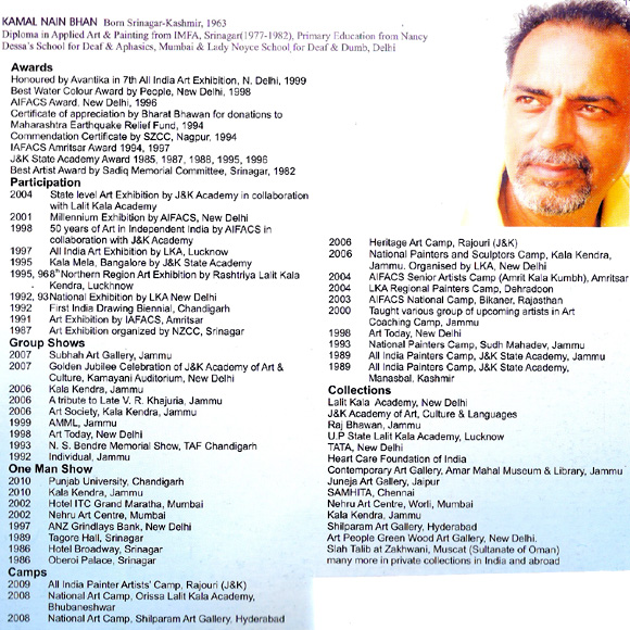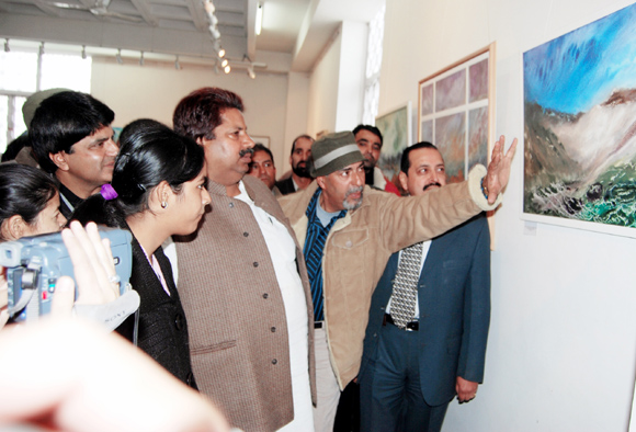 | Shri Ashwani Kumar Chrungoo, in his address, said that Shri Kamal Nain is a very competent artist who has brought out his internal pain and anguish through colours before all of us. Though he has not been able to catch the attention of the people till date because of his resourcelessness, we promise him all support. His themes are varied and within his range come simple presentations in lucid art forms. Shri Bhan’s release of these paintings in connection with 20th Holocaust Day is laudable. | |||