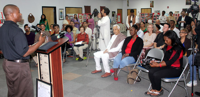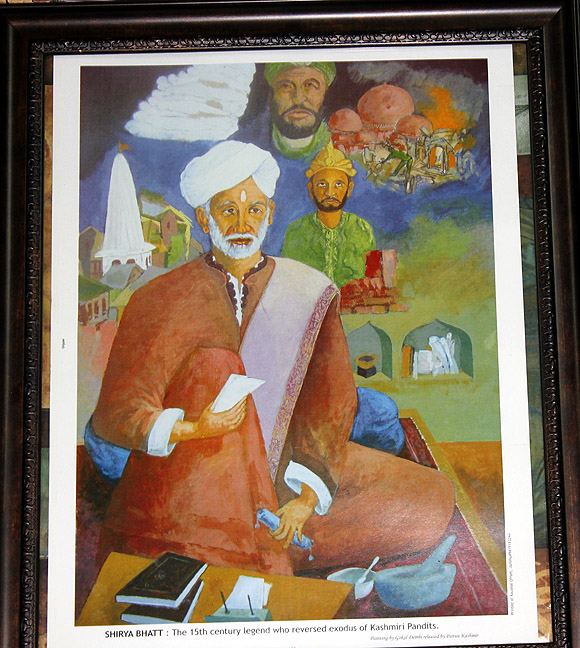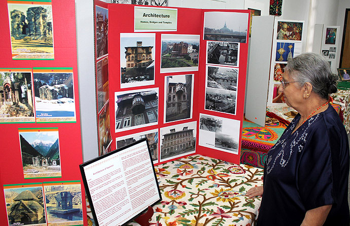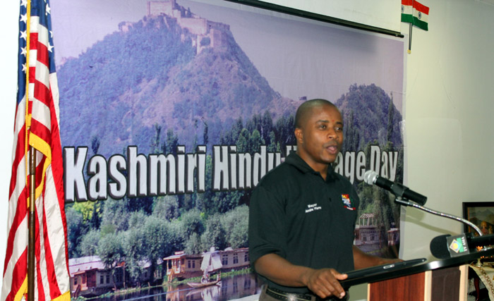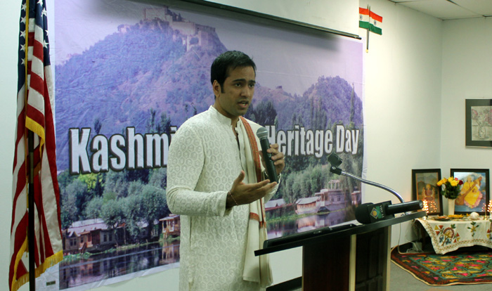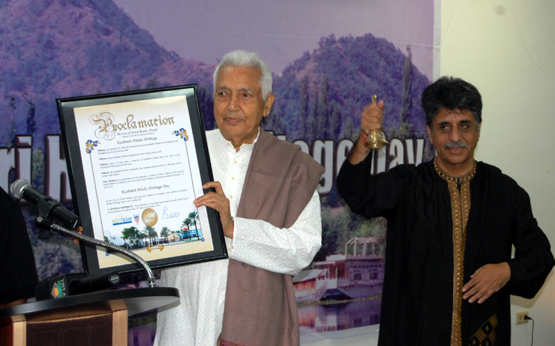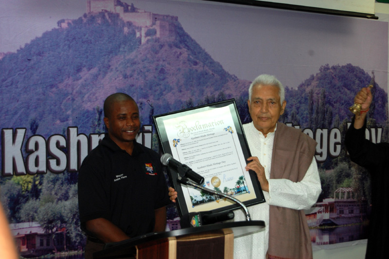 | Mayor presenting proclamation to Pandit Gopinath Raina, Senior Editor-Shehjar Magazine amid traditional Shankh-Naad