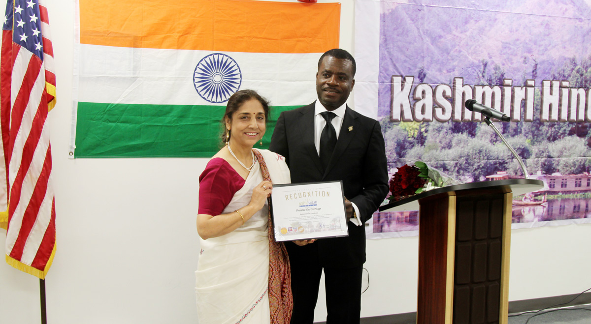 Dr. Smith Joseph then presented a certificate thereby officially declaring January 30, 2016 as Kashmiri Hindu Heritage Day in the city of North Miami.