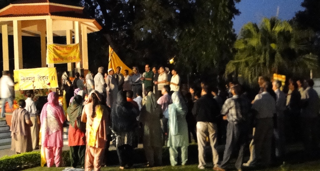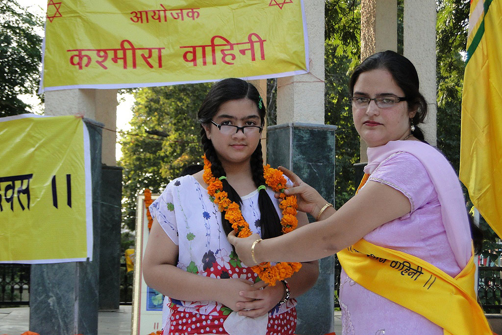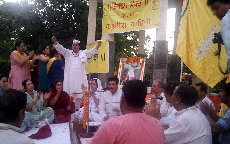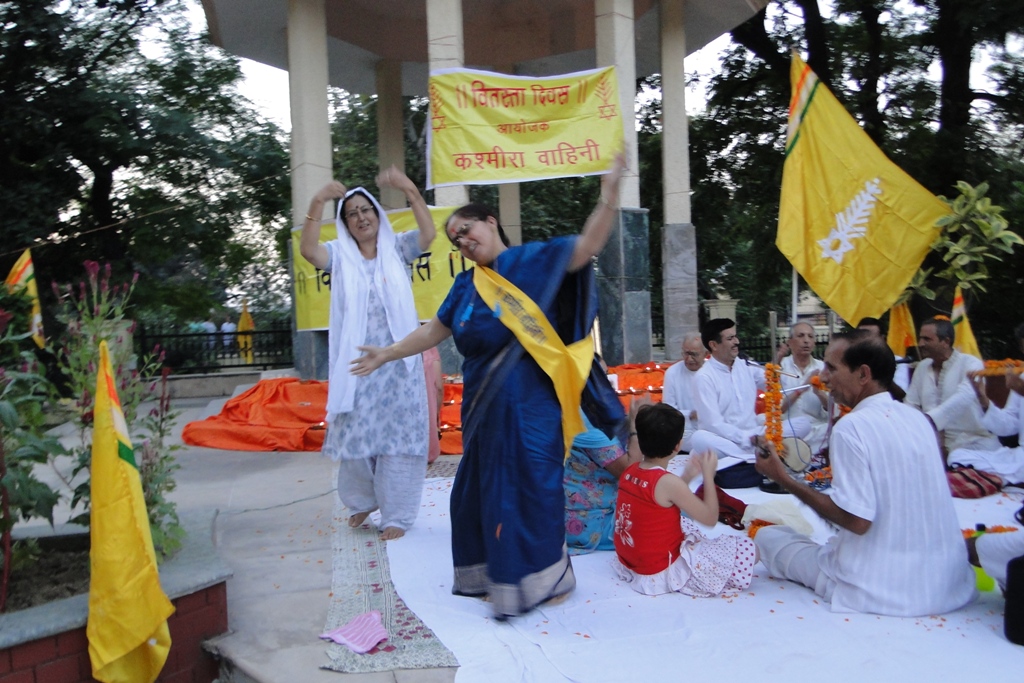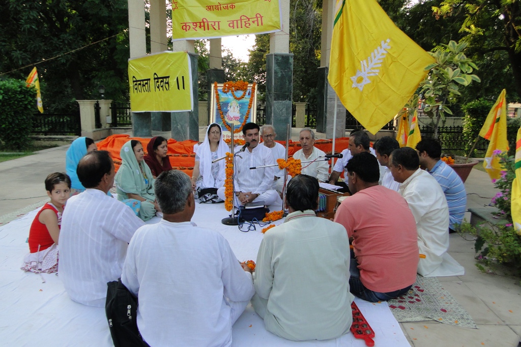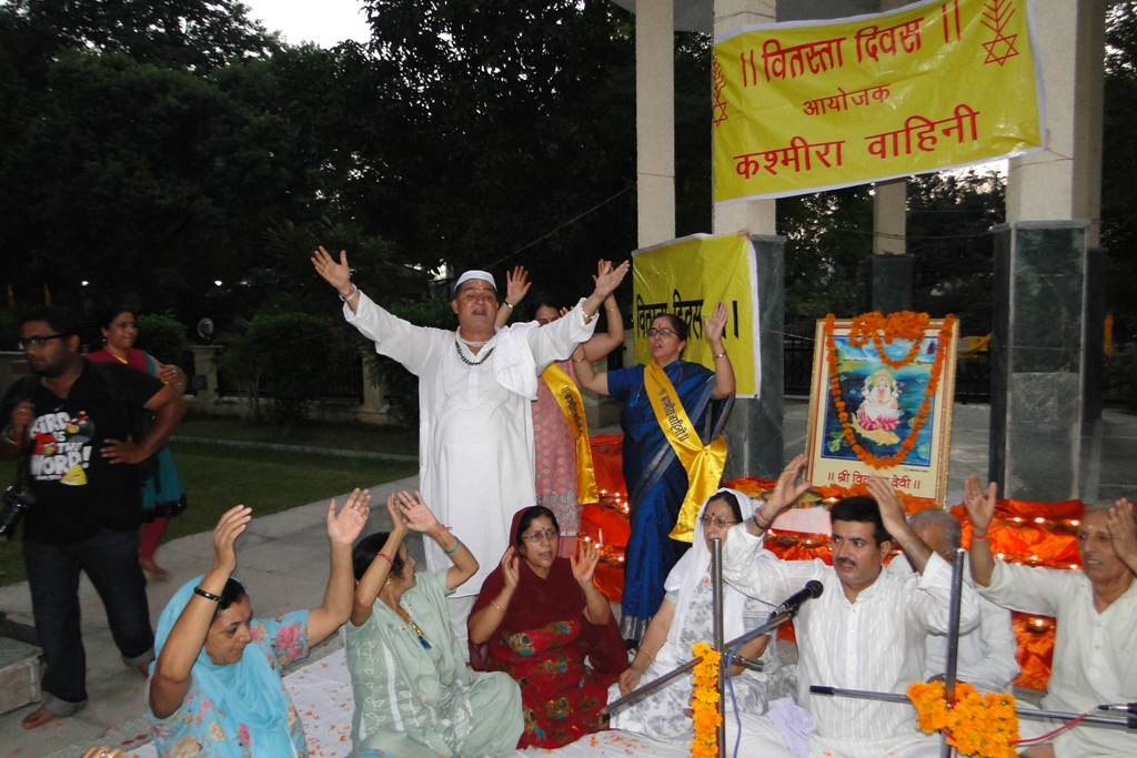 | Vitasta Triyodeshi (Vyath Truvah) was celebrated by Kashmira Vahini on the banks of river Chandrabagha with gaiety and religious fervor where in large number of Kashmiri Pandit women along with men and children participated in these celebrations. Rajinder Park wore a festive look on this occasion. The program started with hoisting of the flag of Kashmira Vahini accompanied by holocaust dhun. Swami Kumar ji, Swami Pran Nath ji Garib “BHAIJEE”, Dr. Manmohan Shastri and and Sh.B.L.Handoo Prsident Brahaman Mahamandal Kashmir inaugurated the celebrations and threw light on “Vitasta Divas” and also on its religious significance. Smt. Nirmala Tickoo welcomed the saints, artists, poets, intellectuals and the people who had turned in large numbers for these celebrations. While welcoming the gathering she expressed her happiness over the overwhelming response vahini got from KP community and women in particular in organizing this year’s Vitasta Celebration across the country. She informed that many community members from abroad did send their wishes and reverence for Mata Vitasta. Sh.Bushan Lal Bhat Sharnagat and his fellow devotees enthralled the audience with their devotional musical concert. Kashmira Vahini appreciated their role of spreading sprituality through HARI KIRTAN jagriti mission.Several upcomming child artists including Anikate Hashia and Shannu Zadoo presented captivating musical hymns.Eminent Artists like Kailsash Mehra, Kuldeep Saproo, Naina Saproo, Deepali Wattal and Shri Ravi Bhan were present on this occasion. Smt Gaytri Hashia presented vote of thanks and Meenakshi Sidha administered the oath to continue and intensify the struggle for homeland. The concluding part of the function was traditional Aarti of the River Goddess Vitasta and “Deep Pravah”, which presented a scene of spectacular synthesis of devotion and dedication on the banks of Chandrabhaga.