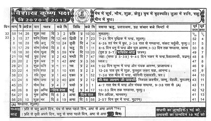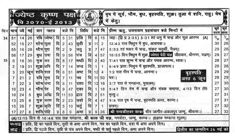 For the benefit of community members, Shehjar is pleased to offer Kashmiri Panchang from April 11 to June 23, from Vijyeshwar Panchang 2013-2014.
