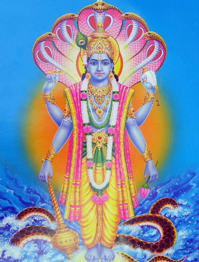| Namaste, My dear children! Lord Vishnu represents the aspect of the Supreme Reality that preserves and sustains the universe. The Sanskrit root word, ‘vish’ means ȁthat which enters into,’ or ‘all pervasive’. He is generally symbolized by a human body with four arms. In His hands He carries a conch (shankha), a mace (gada), and a discus (chakra). He wears a crown, two ear-rings, a garland (mala) of flowers, and a gem around the neck. He has a blue body and wears yellow clothes. The Lord is shown reclining on a thousand-headed snake (Shesha Nag) in the milky ocean. The snake stands with its hoods open and its entire heads looking inwards at the Lord. The four arms indicate the Lord's omnipresence and omnipotence. The two front (lower) arms signify the Lord's activity in the physical world and the two rear (upper) arms signify His activity in the spiritual world. The right side of the body represents the creative activities of the mind and the intellect. The left side symbolizes the activities of the heart that is, love, kindness, and compassion.