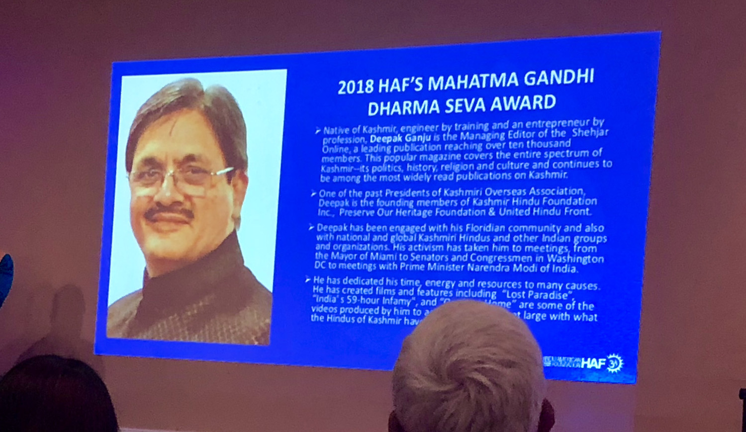 | Speaking at the event, Deepak Ganju thanked the organization for the Dharma Seva award. "For those who do not know me, I am not dogmatic about religion but I do believe in doing the right thing. So you may say that I do my Karma as per my Dharma." "Same as many of you, I have seen a lot of joy in life and dealt with many hardships as well. What has kept me in equanimity most times is just my belief in what I am doing. As such, if I have created an example worthy of such an honor as the Dharma Seva award from HAF, I feel relieved that my thoughts and actions have generally been in the right direction." Providing stastical data to prove his point as to how a small population of Kashmiri Islamists supported by appeasement policies of GOI has taken India as hostage? He provided information on the Kashmir region having a total area of 206,552 square miles, larger than California but smaller than Texas.. Out of the 138,091 square miles of the entire state of J&K, the Kashmir Valley is just 5992 sq miles - 83 miles long x 20 miles wide, less than 5% of the area of J&K. Polulation as per 2011 census was 70 Lakhs expected to be 1.25 Crores in 2018 vs 135 crore in India. Concluding he commend HAF members and all the awardees, as well as many more in the gathering, for being excellent models in the community. "I am just blessed and grateful to be in this company." | |