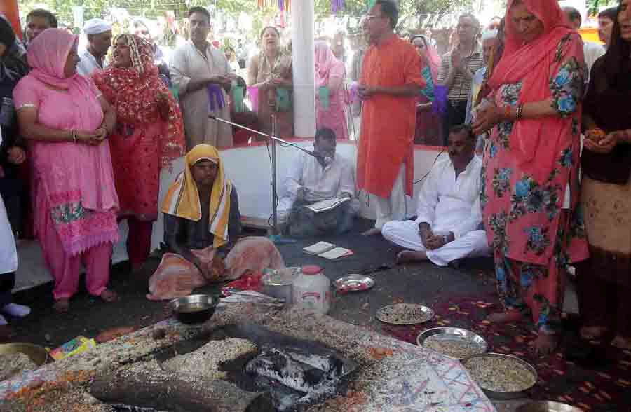 Around fifteen hundred Kashmiri Hindu devotees today thronged the ancient and historical temple of Mata Katyayani at village Kakran in Kulgam district on 4th Annual Mahayagya organised by Harmukh Ganga (Gangbal) Trust (HGGT) and supported by All Parties Migrants Coordination Committee (APMCC) after reconstructing the four temples and a huge Dharamshala within the complex. Kashmiri Hindus reached Katyayani temple on July 23rd, when the Mahayagya began while the Purna Ahuti was performed on July 24 where hundreds more joined them besides some dignitaries. The temple wore a festive look as the remaining restoration and decorative work was undertaken under the supervision of APMCC Chairman Vinod Pandit who has been camping at Kakran for the past more than two months.