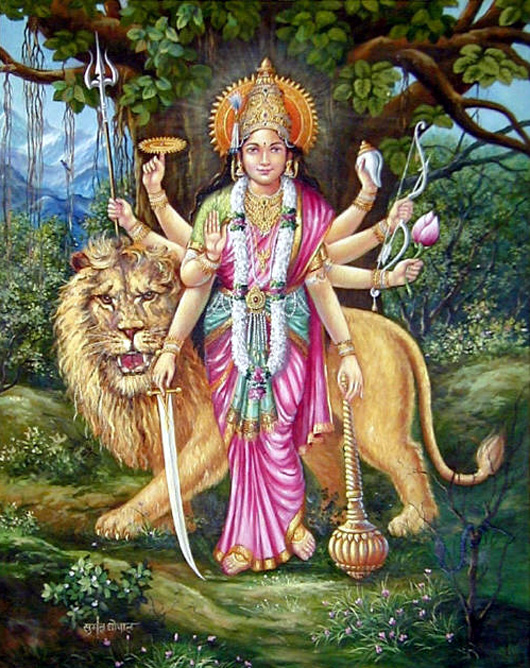 Namaste children! Shiva’s consort or partner in action is Parvathi, who is the source of His energy to perform the task of redemption and regeneration. In her mild and pleasant form she is called Parvathi. One of her well known milder forms is ‘Annapoorani’ meaning the ‘bestower of food’. It is in this form that she is worshipped in the sacred Hindu temple at Varanasi. She is the Universal Mother . She is commonly worshipped in the form of Durga. She represents the power of the Supreme Being that preserves moral order and righteousness in the creation. The Sanskrit word Durga means a fort or a place that is protected and thus difficult to reach. Durga, protects mankind from evil and misery by destroying inner evil forces such as selfishness, jealousy, prejudice, hatred, anger, and ego. In Her image as Durga, She is shown sitting on a tiger, wearing red clothes. She has eighteen arms, carrying different objects including weapons in Her hands. Her red attire signifies incessant activity. She is always engaged in destroying evil and protecting mankind from pain and suffering caused by evil forces. - A tiger symbolizes unlimited power. Durga riding a tiger indicates that She possesses unlimited power and uses it to protect virtue and destroy evil. The eighteen arms of Durga signify that She possesses combined power of the nine incarnations of Lord Vishnu that have appeared on the earth at different times in the past. Thus, Durga represents a united front of all Divine forces in constant combat over the negative forces of evil and wickedness.