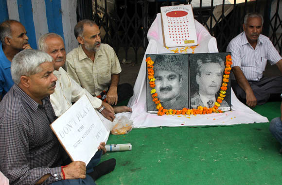 Hundreds of displaced Kashmiri Pandits living in Delhi NCR area today assembled at Yamuna Ghat near ITO and paid homage to their martyrs. Also in great symbolic gesture twenty Kashmiri Pandits tonsured their heads in protest against the total apathy shown by the successive governments in Centre towards the plight of the displaced community.