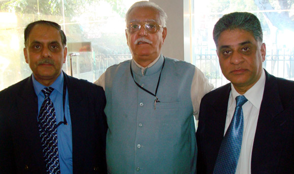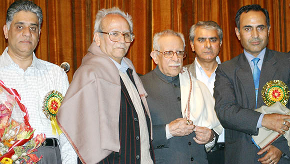 With Sanjay Wali, President KPUF (L) and Dr Romesh Raina, General Secretary AIKS and Deepak Ganju, Shehjar (R) |