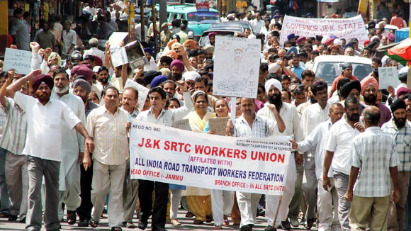 September 8, 2008 Jammu: Jammu and Kashmir SRTC employees protest rally for the release of salary in Jammu on Monday.