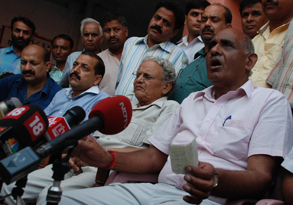 September 20, 2008 Shri Amarnath Sangharsh Samiti Convener Leela Karan Sharma addressing a media person at Geeta Bhawan in Jammu on Saturday . |