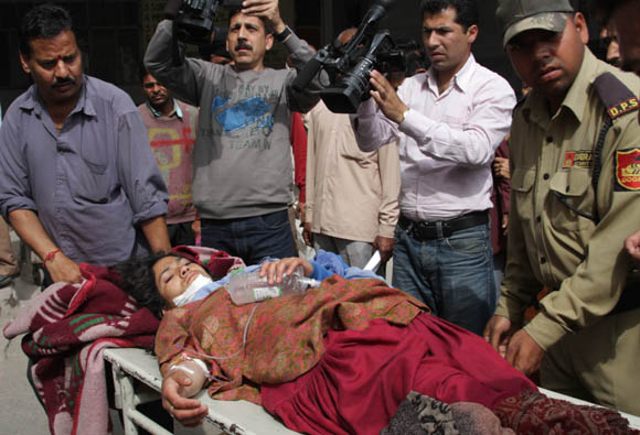 MARCH 06, 2009: Jammu: Seriously injured persons being brought to Government Medical College for specialized treatment after four people were injured in grenade attack by militants in Badherwah town of Doda district of Jammu.