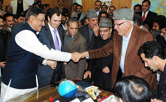 | February 3, 2009 : Jammu and Kashmir Former Chief Minister Dr Farooq Abdullah, Union Water Resources Minister Prof Saif-ud-din-Soz Former Chief Minister Ghulam Nabi Azad alongwith J&K CM Omer Abdullah after filing nomination papers for Rajya Sabha.