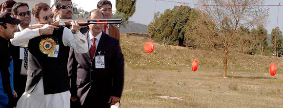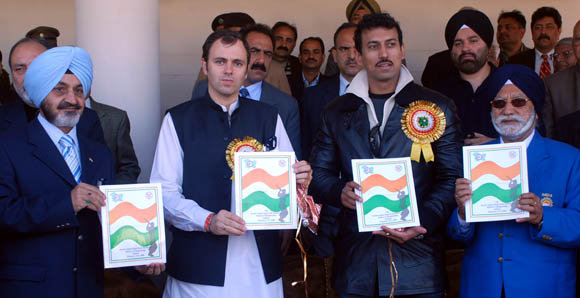 February 4, 2009 Jammu: Jammu and Kashmir Chief Minister, Omar Abdullah shaking hands with international shooter Col. Rajvinder Singh Rathore before inaugurating the 7th All India Sardar Sajjan Singh Sethi Memorial Masters Rifle Shooting Championship at Akhnoor.