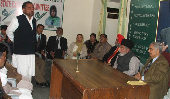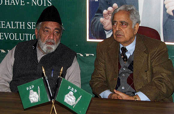 | FEBRUARY 07, 2009: Jammu and Kashmir People's Democratic Party patron and Former Chief Minister Mufti Mohammed Sayeed with Shia leader Maulvi Iftiqar Hussain Ansari chairing the first meeting of defeated candidates of the party to rejuvenate the PDP party.