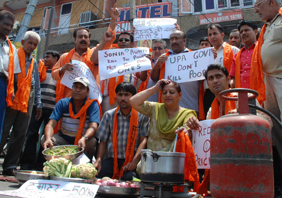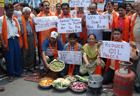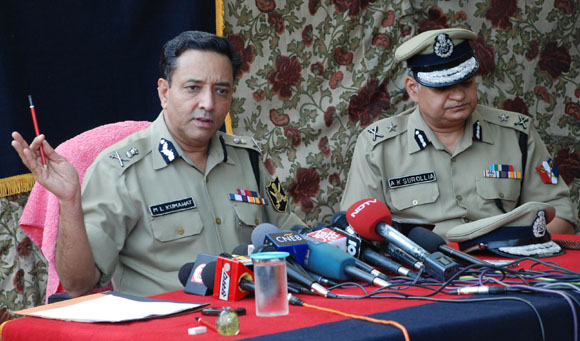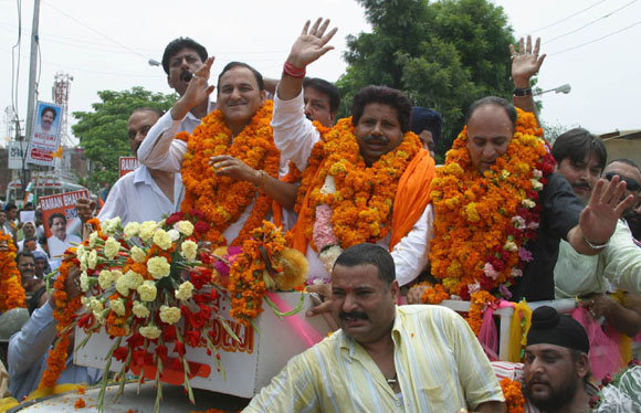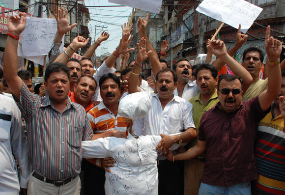 July 16, 2009 Jammu: Congress (I) legislators Raman Bhalla and GM Saroori who were inducted in Omar Abdullah Cabinet as ministers’ recently on a thanksgiving rally on their arrival in Jammu. JULY 18, 2009 - JAMMU: Director General of Border Security Force M L Kumawat addressing a press conference at BSF headquarter . July 20, 2009 Jammu: Activists of BJP staged protest demonstration against the decision to establish Central University in Srinagar instead of Jammu by the Cong-NC coalition government and burnt an effigy of J&K Chief Minister Omar Abdullah |