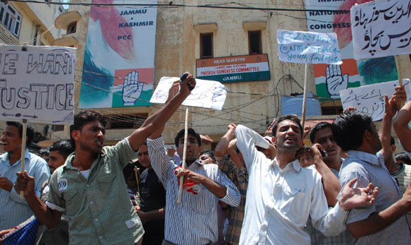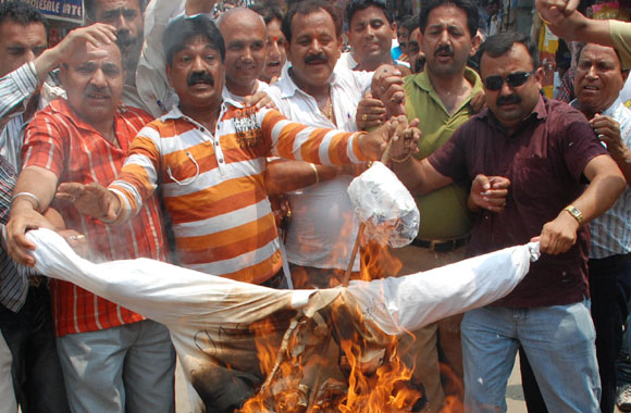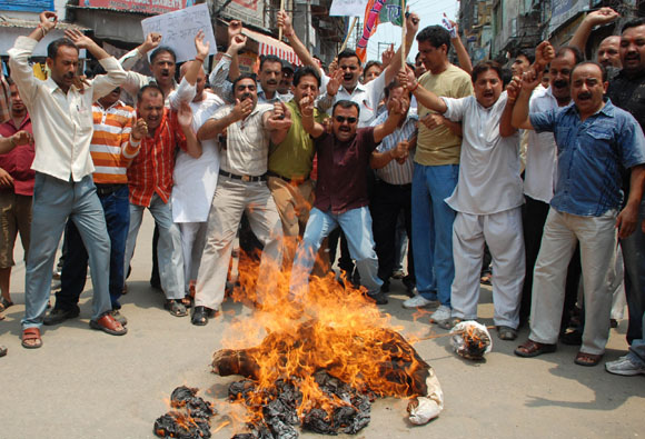 July 15, 2009 Jammu: Congress Workers came out on streets openly protesting Prof Saif-ud-din Soz for trying to destabilize the National Conference –Congress ruling coalition by creating fissures in state congress and ignoring senior most leaders during Cabinet Expansion of Omar Abdullah government. |