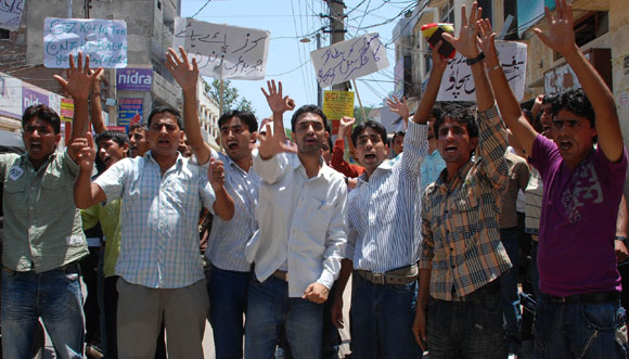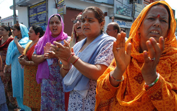 ![]() ![]() ![]() July 21, 2009 Jammu: Kashmiri Pandits staged a massive protest demonstration against the government for failing to curb acute water sacristy in the city while temperature shows no signs of decline in Jammu . |