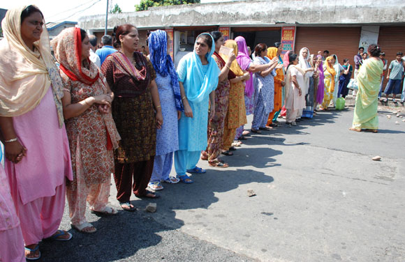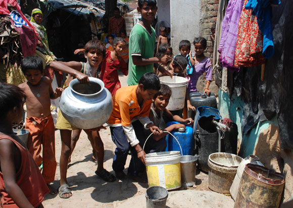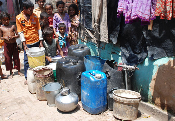 JJuly 16, 2009 Jammu: Children’s wait in queue with their water pots to collect drinking water in Jammu on Thursday. There is not direct supply of potable water at homes in most of the poor neighborhoods and people have to depend on regulated supply of water from public tap erected on roadsides, with a single tap catering to hundreds of households.