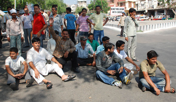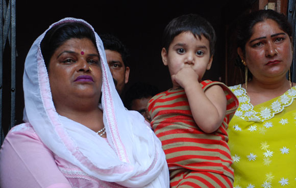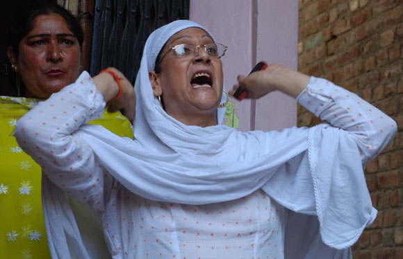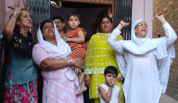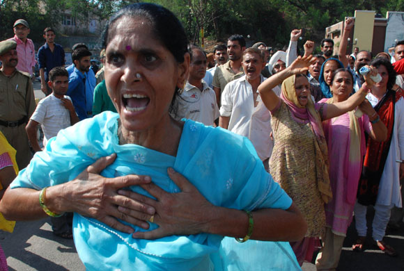 July 15, 2009: Family members of a new born baby,who went missing from the incubator in SMGS hospital yesterday blocked the road and shouted slogans against hospital and police authorities for failing to nab the culprits and recovering the baby police resorted to mild cane charge to control the aggressive family members in Jammu.