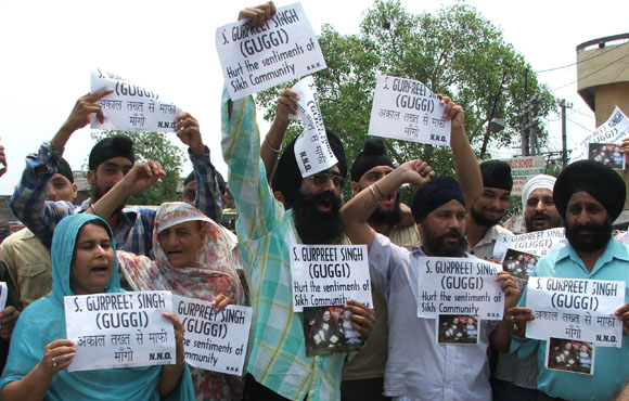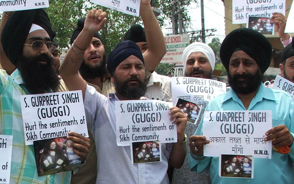 July 20, 2009 Jammu: Members of Sikh Community staged a protest demonstration against popular comedian S.Gurpreet Singh Alias (GUGGI) for hurting the sentiments of Sikh Community by participating in a programme of STAR ONE “Hans Baliye” with open hair and requested Sahromany Gurudwara Parbandhak Committee President S.Avtar Singh Makker to announce a suitable punishment for the Punjabi Actor .