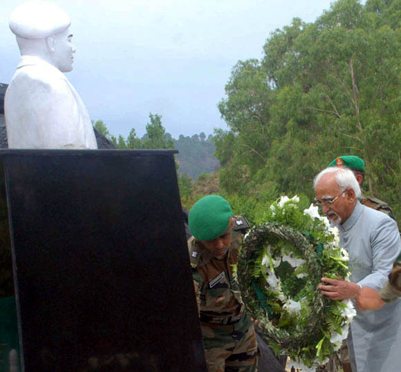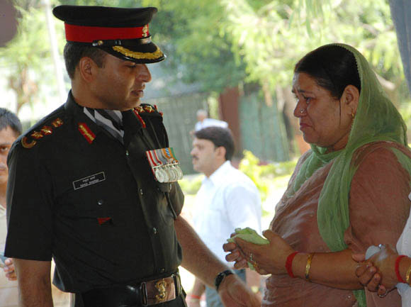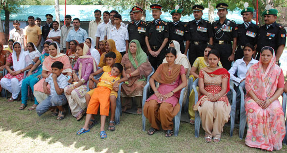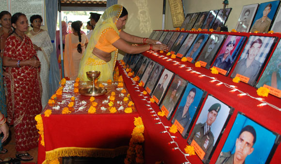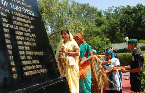 July 4, 2009 Jammu: Family members of the martyrs of 18 Grenadiers laying wreath at the War Memorial during a Special Sainik Samelan held at Samba Garrison, 48 KMs from Jammu, to remember the martyrs of Tiger Hill during Kargil War on July 01, 1999 in Drass Sub-Sector for which the unit received Param Vir Cakra and celebrated the Battles Honour and Theatre Honour Day in Jammu