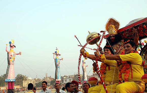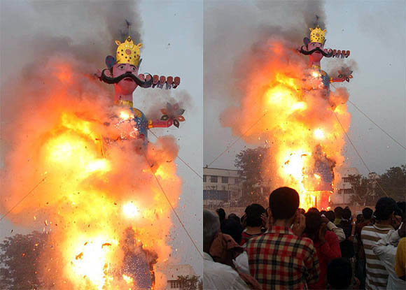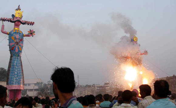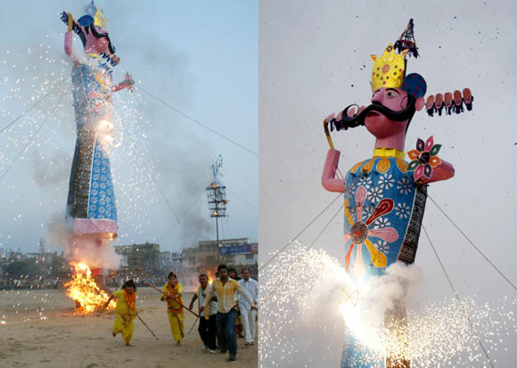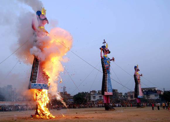 September 28, 2009 Jammu: The effigies of demon king Ravana, Meghnath and Kumbhkarna are burnt on the occasion of the Hindu festival Dussera. |