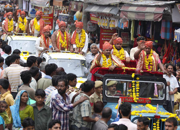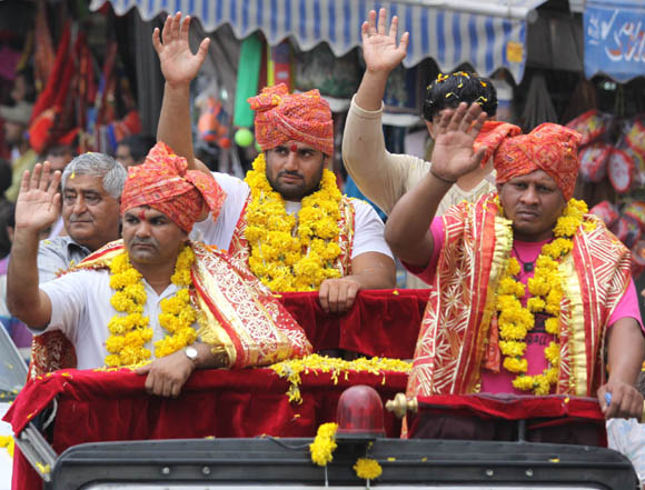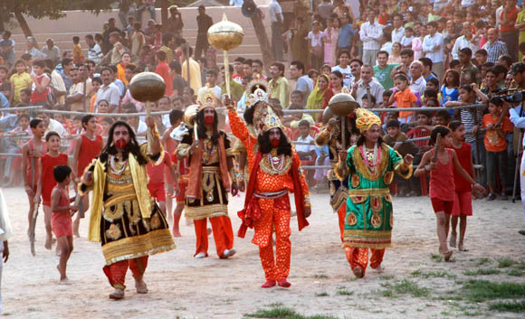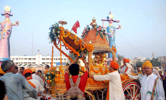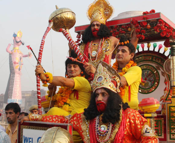 | September 28, 2009 Jammu: The characters of Lord Rama alongwith Lakshaman and Hanuman on their way towards Mini Stadium to destroy the Statues depicting Ravana and his brothers to register the victory of good over evil and culminate the nine day long Ram Leela.