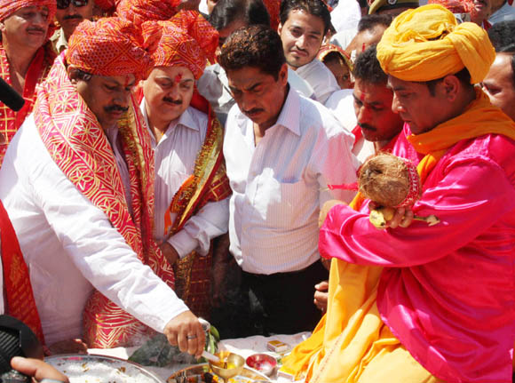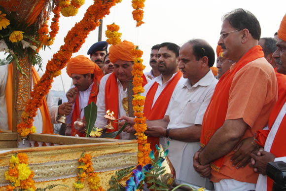 | September 28, 2009 Jammu: Deputy Chief Minister Tara Chand performing the final ‘aarti’ before the ‘Baghi’ of Lord Rama before the Dushera celebrations at Mini Stadium in Jammu