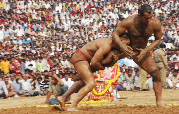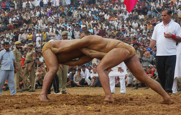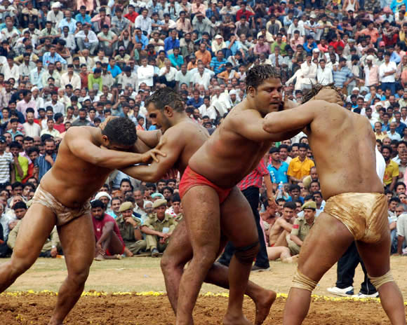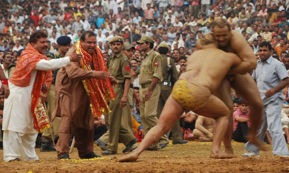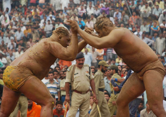 KATRA (JAMMU), SEP 22:- Pakistani wrestlers engaged in a friendly bout with their Indian counterparts at Swami Vivekanand Sports Stadium during a friendly fight with the Indian wrestlers during the ongoing nine-day long Navratra Festival in Katra 48, kms from Jammu September 22- Jammu: Pakistani wrestlers take part in a colourful procession with the regular daily Navratra ‘Jhanks’ in Katra near Jammu. Wrestlers participated in a friendly wrestling match during Navratra festival. September 19, 2009 Jammu: Colourful Jhankis being taken out during the nine day long Navrata festival organized by Tourism Department in holy city of Katra 48 kms from Jammu.
