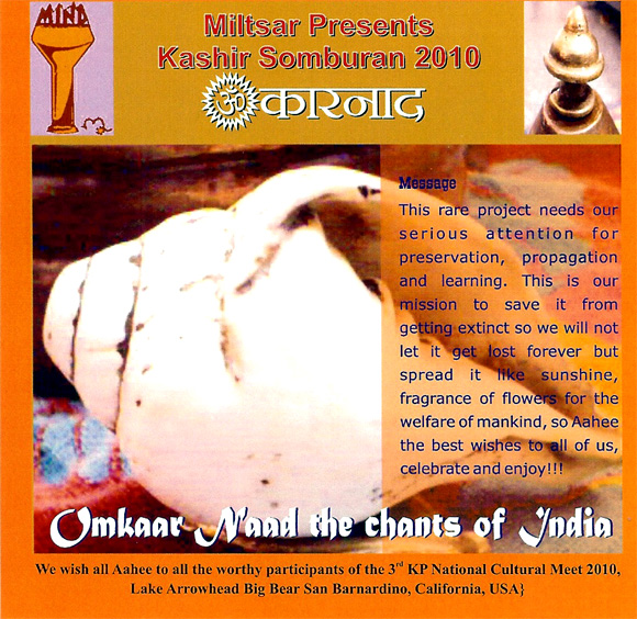 OMKAR NAAD comprises of about 5 hour recording of hundreds of Mantras, Beejakshar Mantras, Pojaas, Sootras and Stotras will be released on July 24th at J N Kaul memorial Hall, Sharika Bhawan, Sector 17, Faridabad,. India. The CD has already been introduced in USA during a glittering ceremony at KHF event KP National camp at Big Bear Lake in C.A and at KOA camp in NY. It is available for sale in USA with Kashmir Hindu Foundation Inc.