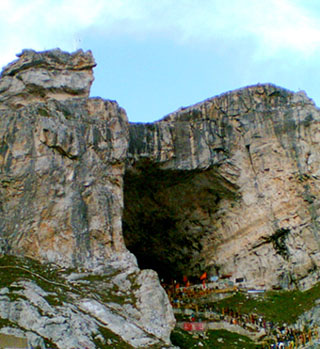 | The Cave Shrine The final lap of about 7 kilometers from Panchtarni to the cave shrine is performed in the early house of the full moon day (Poornima) of the bright half of the liunar month of Shravana. The huge natural cave (15 meters long, 17 meters wide and 14 meters high at the center) is in the midst of a mountain amphitheatre and seems to have been carved out of limestone by elemental forces. Before entering the mystic environs of the cave (3880 meters), the pilgrims take a holy dip in the Amravati, a tributary of Panchtarni Nala, which in turn flows into the Sindh river, a major tributary of the river Jehlum. The snow-fed Amravati cascades from the west of the cave. The pilgrims rub Amarboot, a chalky compound consisting of chloride or sulphate of calcium, all over their bodies in preparation of one of the finest sights of supernatural glory, the magnificent Ice-Lingam formed by water dripping through the lime-stone roof of the cave. |