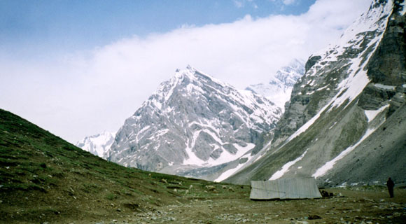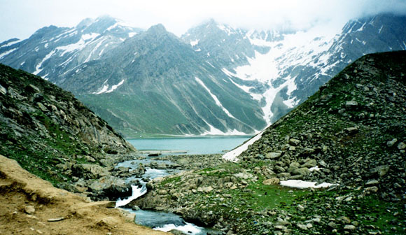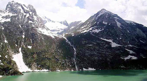 | Blue Glacial Lake of Sheshnag En-route down below Wavjan lies the glacial lake-Sheshnag (3570 meters) with its sprawling deep Prussian blue waters, at once clean and icy-cold. The placid lake is ravishingly beautiful. When the sun looks in the mirror of Sheshnag with the towering snowy peaks silhouetting the border of the Lake, the effect is gorgeous with divine chiaroscuro. Since Sheshnag is associated with the seven-headed mythical snake on which Vishnu, one of the holy Trinity, reclines, the devotees take a dip before marching onwards to brave the steep 5-kilometer climb up the dizzying heights of 4350 meter high peak known as Mahagunas (the great serpent). To the students of history, Sheshnag is the symbol of Kashmir’s pre-historic past when the whole Valley was a huge lake, known as Satisar whose waters were drained off by one Kashyap Rishii by making a cut in the mountains. Trek to Panchtarni From Mahagunas peak, the track goes down and wades through wild flower meadows, called Poshpathar, with such intense and intoxicating scents that the pilgrims are warned not to linger too long, lest they swoon amidst the variety of fascinating myriad-colored flowers. The route continues to dip till the pilgrims reach Panchtarni, so called because of the confluence of five streams. It is a glacial Valley, turned into a lush green meadow with an abundance of camping sites. Whatever physical strain one may have experienced in the ascent to Mahagunas peak gives way to a sense of joy at the downhill trek to Panchtarni. |