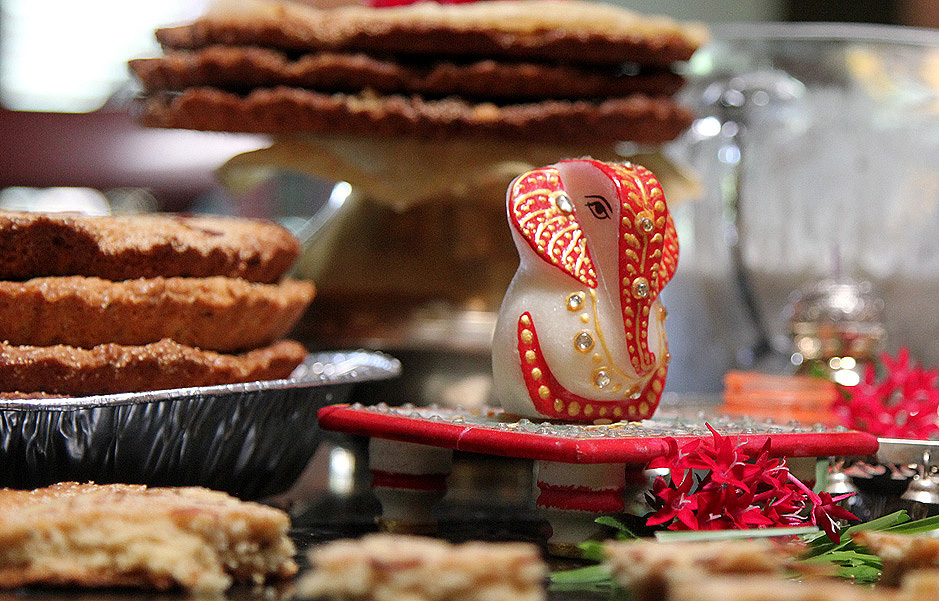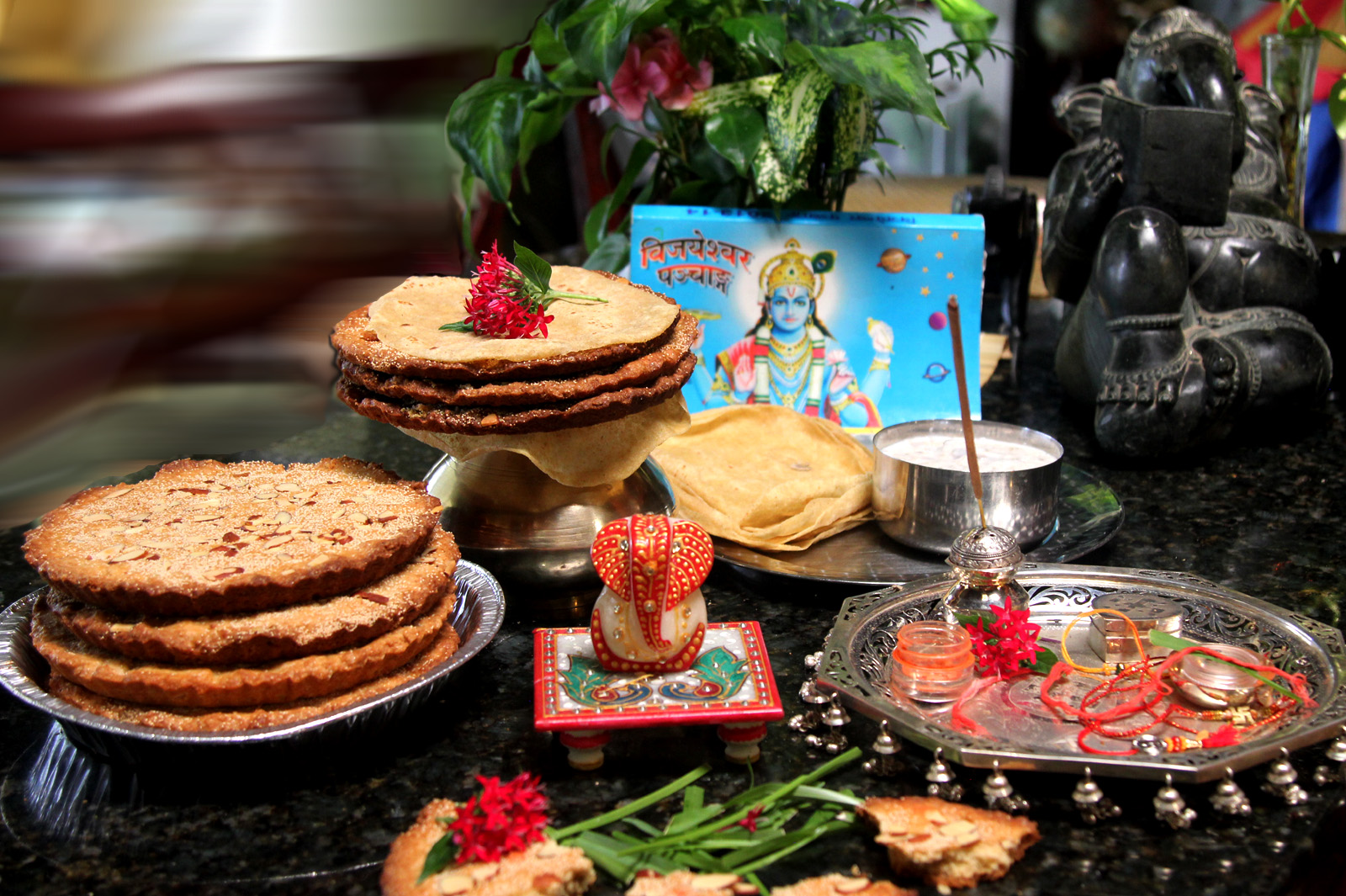 | Punn Diyun is a Vaishnava ritual related to the invocation of Vishnu as Bhagawan Satya Narayana, in Kashmir during the Shulka Paksha/Bright fortnight of the month of Bhadarpada--corresponding to the month of August/ September. In Kashmiri Pandit heritage, this occasion is revered as सत्य देव / Satya Dev, by offering पूर्य Puurya and रोठ Roath to the Satya Dev Bhgawan, along with Shri Ganesha. This day is not the specific Tithi, but should be any Shubh Muhurt--auspicious day in this Paksha of Bhadarapada, as is calculated and recorded, in the Kashmiri Panchangs. About the word पन्न -- Punn: Punn as a Kashmiri word, meaning thread,and Diyun means to offer. It means to offer the "Thread"--a spiritual obligation in the form of Thread ring that is being tied to the Pot, known as Kalasha. it is generally a brass pot of an elliptical shape revered as the symbol of Lord Brahma, and Varuna Devata /water. The Devata finds its abode in the Kalasha. पन्न Punn word also theवैदिक शब्द word in essence, which means to be worthy of admiration, or to admire to regard with surprise and wonder, to praise and acknowledge. It also means to be glad and glorious. This word has its source in the Sutra सूत्र, स्थुर in Kashmiri, which makes a person learn to be humble, meticulous in his working, and very soft towards the deprived, and to recognize the inner self. It does nort speak of renunciation at all, ather to be in association with the social environment. since it is Vaishnivite ritual, therefore the pot is adorned with flowers of different shades and colors. The Sutra, which is स्थुर ------ An old oral tradition is described here under: The Sutra or कपास/कपस is grown in the fields. Later, it is to be spin on the spinning wheel, after taking the कपसि ट्वट -- seed out of the raw cotton. The spinning wheel is known as यंदुर in Kashmiri. A girl child is supposed to spin the cotton,to turn it into yarn thread, and that thread is offered to the Satya Deva, who is said to have its presence in that Puja, at that particular muhurt/moment. The Sindoor, flowers, नार्य वन and रोठ is offered according to the traditioanal puja with the Naivedya Mantra, known as the प्रेपुन्य . Preparation of रोठ Roath Roath is prepared with wheat flour kneeded with water and milk.and deep fried in ghee. Some would bake the Roath, though kneeded with ghee. It is known as the सवा सेर रोठ। The green cardamom is mixed during kneeding. After frying or baking, Khaskhas-- खश्खाश is applied for decoration purposes as well. Some would make the circular designs with the small circular cup stand. To establish the sanctity of the Punn diyun, the Puja room is washed, all the necessary utensils needed for making a Roath is washed with हुरि म्ये.च --- yellow soil, It is mostly the eldest lady of the family, who narrates the story of बीब गर्भ माs ज, explaining the essence of Satya Narayan Devata, who is Vishnu himself. She would explain the necessity of observing this ritual,purely to ward off ill omens and to bring peace.progress and prosperity in and around the family. That is why, the Naveed is distributed to the neighbours and relatives, without any distinction. Present day procedure: Since the times have changed,now the Punn is not being spinned any more. Only, Diya Batti has replaced the Punn. but all other modalities are followed. except washing with soil, instead the detergent is used to clean the pots/utensils during puja and for preparation of the Roath, which is really very healthy step. The offshoots of green grass, known as द्रमुन is offered to the Devata, with all devotion. After the Puja is over, the Naveed is partaken with all devotion and dedication, even in the KP diaspora. The eldest one of the family observes a fast, but is not obligatory. This day is dedicated to Beeb Ghar Maij, deriving its source of inspiration from the Skanda Purana. About the name ---- बीभ गर्भ माs / Biibh Garbha Mai'j, the main Deity of the Pann Diyun Katha. बीभ is a Sanskrit word, which means --- to put in higher acclamation, in the Post Vedic scriptures. गर्भ Garbha means the cosmic womb, माsज Mai'j is the Divine Mother. That is why we invoke the Divine Mother in the Brass pot/ Gada, with the offering of दूर्वा Durvaa--द्रमण कानुज। The color of brass is of golden hue, hence the brass pot is recommended in the Puja. दूर्वा Durvaa-- द्रमण कानुज stands for the शाकम्बरी देवी / Shakambari Devi. Majority of the Kashmiri Pandits do celebrate the पन्न दियुन, but some families instead perform, Anant Chaturdashi, observing the same ritual of making the Roath. Some address पन्न देवी, as the Bhhib Garaz Mai'j, which does not seem to be correct, as the deity invoked in the pot can never be selfish, as the word ग़रज़ / Garaz stands for. Acknowledgement:---I am thankful to Mrs Chandramukhi Ganju for putting the Roath Katha, published ealier in Shehjar, which is given below |