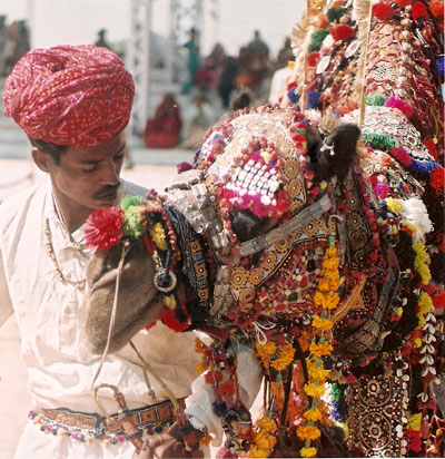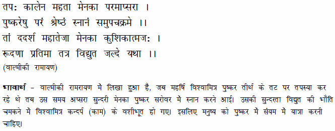The holy Pushkar is a unique celebrated place of pilgrimage, where the setting Sun kindles the Hillock Aravallie with pale fire. It is a place where white and saffron clad Brahmins chant Mantra’s with loud voice, purifying the inner soul. A place where the myth and culture interact to create life long memories for the pilgrims as well as the tourists. Thoughts and faith, the imposing architecture of north and south, the Mantra and Tantra and fascinating listening experience turns Pushkar ablaze with color. The religious and spiritual symbolism and the diverse art, developes a long rapport with the deity. Pushkar lake, a semi-circular lake with 52 Ghats is situated with Aravalli hills on three sides and sand dunes on the fourth. It is about 13 Kms west of the city of Ajmer in Rajasthan, India. This holy lake is also known as the king of the 'TIRTHAS'. There are four holy places of Hindus (Badri Narayan, Jagannathpuri, Rameshwaram, and Dwarikapuri) but the Holy dip at this Lake is considered as attaining salvation especially on Kartika Purnima. The earliest literacy reference to Pushkar is found in Ramayana. Following is the quote from Ramayana: |