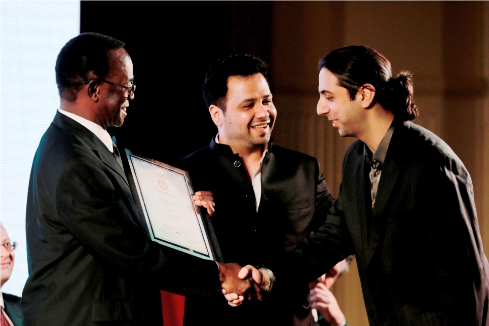 | Abhay Rustum Sopori receiving Pride of India Award from Dembo M Badjie Ambassador of Gambia & Manu Jagmohan Singh |
