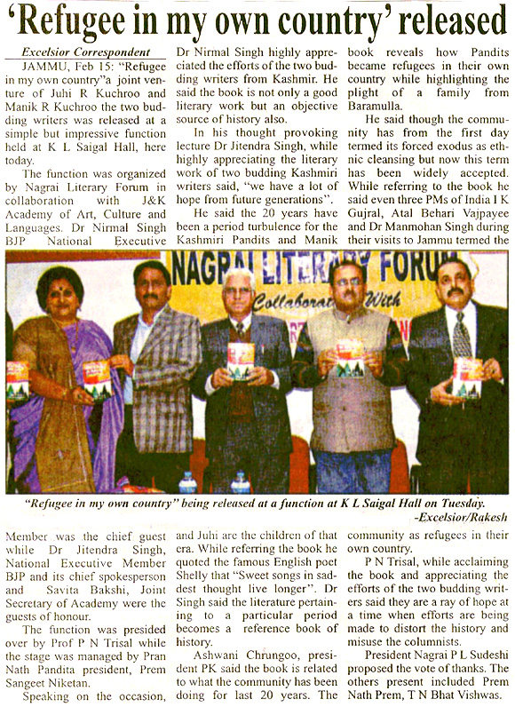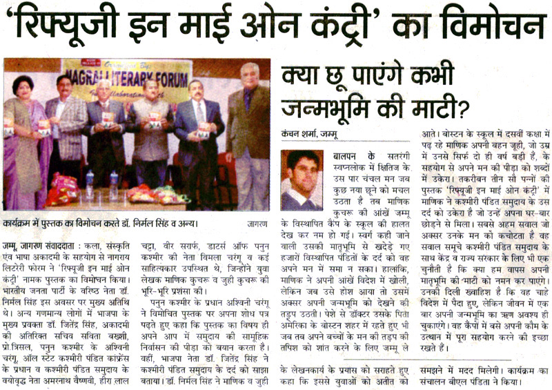 | The book was released in February, 2011 in Jammu by Nagari Literary Forum in collaboration with J&K Academy of Art, Culture and Languages. The proceeds from the sale of the book will go to support the refugee children from the valley. Book will be available at: a. email: kkuchroo@rcn.com, 617-965-1937, 617-852-8810 Cost is $ 10 and all the proceeds from the sale will go to support the refugee children. |