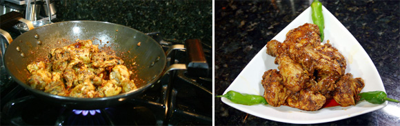 - Cook approx. for 5 minutes or until water is absorbed and chicken is left with oily masala/ spices.