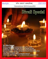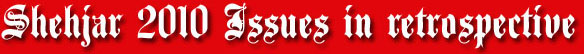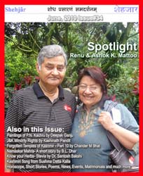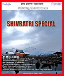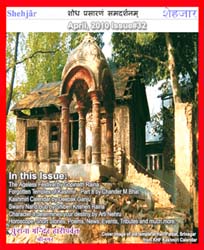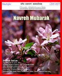 | Dear Shehjar readers, When we started our 1st issue in August, 2007, about 3.5 years ago, it was only a dream that we would be coming out with issues regularly month after month, with content which would relate to such diverse interests and profiles. Fulfilling your knowledge and informational needs on Kashmir related topics as well as providing you news, views, quality analysis and meaningful entertainment has since been the purpose of our efforts. We wish to thank you, our readers and writers for bringing us this far, and making it possible for us to keep serving an ever growing readership. Without the untiring efforts of our writers and development team, it would not be possible for us to bring issues at regular intervals. A special mention should be made of these writers and volunteers who have supported us by submitting timely articles and through their programming and web-development efforts. Acharya Surinder Gautama, Shri Gopinath Raina, Dr. Chamanlal Raina, Dr. K.L. Chowdhury, Dr. Satish Ganjoo, Shri P.N. Ganjoo, Shri Chander M Bhat, Shrimati Chandramukhi Ganju, Shrimati Jaya Sibu Raina, Shri Jawaharlal Bhat, Shri B.L. Dhar, Shrimati Bhumika Raina, Shri Chander M. Bhat, Dr. Anu Munshi Khandhar, Dr. Smita Pandey Bhat, Raman Raina, Arman Koul. Shri KanyaLal Raina, Miss Arti Nehru , D. Jayakrishnan, Gayatri Ganapathy come to mind along with several other people who we are unable to list here. Please do check our profile pages of our wonderful authors at http://www.shehjar.com/authorlist.html . We also thank our poets, artists, singers and musicians including renowned names like Kailash Mehra Sadhu, Neerja Pandit, Arti Kaul, Rajinder Kachroo, Dinanath Wali, Virji Sumbly, Abhay Rustom Sopori, Ashoke Pandit and Veer Munshi for sharing their creativity and talent through the Shehjar website. Also, when you find an article, song or video of interest, please provide your feedback on the website and/or email it to editor.shehjar@gmail.com . Please see above links to the 2010 issues of the Shehjar magazine. | ||||||||||||