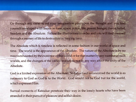 Many books have been written on the exiled Pandit exodus, driven out by killing and burning their houses but this is the only book in which burning of their hearts has been depicted. The flames of his heart are rising from varied directions, and spread the effect in all directions. It starts with prayers to the supreme father of light and life with the prayer, “Teach me how to calm life’s storms”, as he feels helpless due to shock of being exiled. Such a state of mind causing many diseases and lack of confidence has been established by the research conducted by one of the most popular Kashmiri Doctors, Dr. K.L. Choudhry. He was moved by observing misery of Kashmri Pandits to the extent that he started a free hospital with the help of his colleagues called Free Shri Bhat Hospital where even medicines are also distributed free to patients. Similarly, the poet feels terrified in his subconscious mind. In the poem titled ‘Sleeping Bones’, his subconscious mind is reminded of dreadful silence of graveyard where bones of those who once enjoyed delightful life and umpteenth spring seasons are found beneath the soil. The Poet says “the greatest of the great have found place underneath this earth leaving room for shallows to know and understand”. The poet thereafter gives out a poem of a beggar woman who is weak, crippled and lonely. All passers by move on without showing any sympathy for the dying beggar. The beggar woman is responsible herself for her plight. Whosoever is responsible for his or her plight, even the thrown away paper plate shows no concern. It is followed by the poem ‘Illusion’. The poet questions; Is life an illusion which includes the visible and invisible things seen and felt by us?. The concept of life is deduced as dream in a dream! This is what our upnishads explain very lucidly. The artwork illustrates it with a semi nude lady lying down. Trekkers trekking, Castles standing, Bin Laden and eleven September incident, people and buildings falling like ninepins and two lions pouncing over a nude lying lady. The author asks - do you mean that life is a dream in a dream? Poet makes us to feel that every thing what ever is witnessed by us is simply an illusion and there is some supreme Power which makes us to play the game of life in this universe. He has total control over us. Whatever is done by any body, it is not he who does it but, it is He(God). The poem ‘Other Self’ is illustrated with attractive females and male watching with watchful eyes. This confirms to us that every one of us as felt by the poet is having two personalities. One which he proclaims and the other which he keeps hidden – the other self. The author has been able to surface the hidden personality of men. Further a lady on roof top during midnight pining for someone in the other verse is mentioned by the poet as strange desires at untimely times. The poet here has been able to peep in the minds of the fairer sex in a way that at the time when she ought to have been in the bed room with her husband, she is at the roof top to make her genuine desires surface in her mind, but due to non availability of space in the single bed room in which all the family members sleep, she has no room to make a room for her. Her genuine desires have become her strange desires. In the poem ‘love’ poet says love is a natural phenomena and adds that we are born to love, so we must enjoy loving. But, he strikes a sad note that it is God who makes us to play love game and finally culminates in death. The suffering mind of the poet does not get out from the trauma even in the love game. Similar thoughts have been expressed by a great Kashmiri poet – Rahman Dar. He says that he ran after love which shall always remain in this world but, Rahman, shall be no more. Saddened mind of the poet is reminded of another tragic event in his subconscious mind about, ‘Killer Tsunami’. He is reminded of tragic drama of death where even children, houses, property, boats along with dreams of people got washed away in sea and sand. The paintings add to the sad effect of the poem on the mind. The poet though melancholic by death feels that death is what every one of us has to face one day but aspires for the wanting dreams which he had weaved in the sea and sand, but were washed away. ‘My road and me’ is the title of another poem. He mentions that his road and he himself are partners of life and he treads on it with a hope of better future. He feels that his road is lonely without him and no one else can be its partner. The poem is illustrated in one of the beautiful art work which leads him to a wavy road full of obstacles. In between, his supposed to be destination and the half tread road is a beautiful spot where he wants to take rest, but feels that the path has to be tread without any stoppage any where and definitely every new day should bring new enthusiasm in him. In the poem ‘Avouchment’, the poet says religion is exaltation of self through transformation. It is spiritual discovery. In genuine religious experience one feels presence of God in every thing and hatred and shallowness of mind disappear. The art work exalts the poets’ ideas. I whole heartedly appreciate the work of Mr.M.K. Raina Ratnakar and the Artists who have worked for the verses of Ratnakar to give us a blend of the work of art and literature – ‘Surreal Moments’ in the true sense to be appreciated by all men of intellect. The book is available from Scansion Publishers and can be had from the poet as well. The same is only a telephonic call away. | ||||