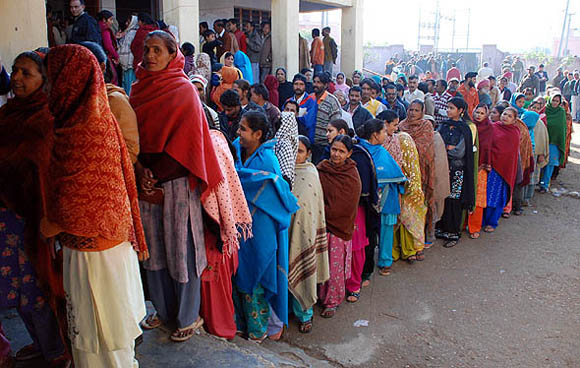 Queuing up to cast their vote outside the polling stations during the last 7th phase of the J&K Assembly Elections in Jammu. Photo by Raman Raina