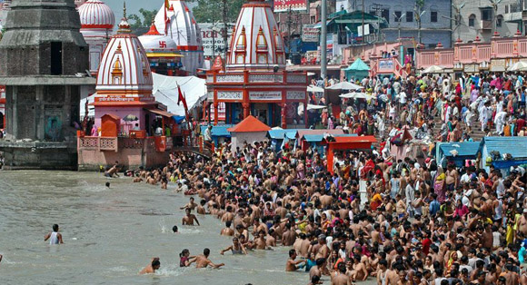 The Kumbha Mela at Hari-dwar (literally meaning the ‘gateway to god’) in Uttaranchal is held when Jupiter is in the zodiac sign of Aquarius in juxtaposition to the Sun in Aries; the festival at Prayag in Allahabad takes place when Jupiter is in Taurus in juxtaposition to the Sun in Capricorn; the one at Nasik in Maharashtra is held when both Jupiter and the Sun are in Leo; and at Ujjain in Madhya Pradesh, it is held when Jupiter is in Libra in juxtaposition to the Sun in Aries. The four earthly sites, according to the Hindu mythological lore, received drops of the amrit (divine ambrosia) which was obtained by churning Ksheer Saagar (the primeval ocean of milk) in the wake of continuing battle between the gods and the demons.