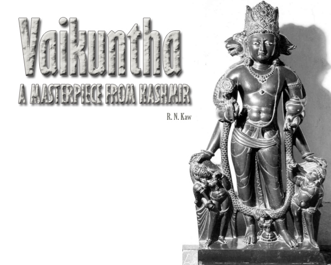 | The best preserved image is actually from Avantipur (Kashmir). As per Kalhana Avantipur town enjoyed sanctity as a holy tirtha resorted to by people at the approach of death with the hope of obtaining a heavenly life. The image was photographed by me in 1974 on the verandah of the Gadadhara Temple at Srinagar- Kashmir. The image was retouched thus the photograph is a refashioned. Gadadhar Temple, Srinagar. is situated on the banks of the river Jehlum and is one of the most beautiful temples in the country. Vaikuntha carved in the round, this image of fine workmanship has four faces: the principal face, with a mark between the eye-brows, is benign and represents Vasudeva-face; the right face is leonine and stands for Sankarshana; the left face is that of a boar and symbolizes Aniruddha; and the fierce looking Kāpila face with jatābhāra on the rear signifies Pradyumna. Of his four hands, the upper right and left carry respectively the stalk of a full blown lotus and a conch-shell, while the corresponding lower hands rest above the heads of Gada-devi and Chakra-purusha, both holding a chāmara with their right hand. Between the stretched legs of the image is the upper portion of Prithvi, the Earth-goddess, emerging from the pedestal, with her palms touching the feet of the god. The main image is draped in a dhotī held by a belt to which is attached a small sword. A folded scarf encircles the thigh. With the kaustubha jewel on the bosom and an upavīla, the image is bedecked in a long vana-mālā, a beaded hāra, valayas, armlets, finger rings, flower shaped kundalas and a richly-embellished elaborate crown. Four headed images of this type are called Vaikuntha, Chaturvyūha and Chaturmūrti. |